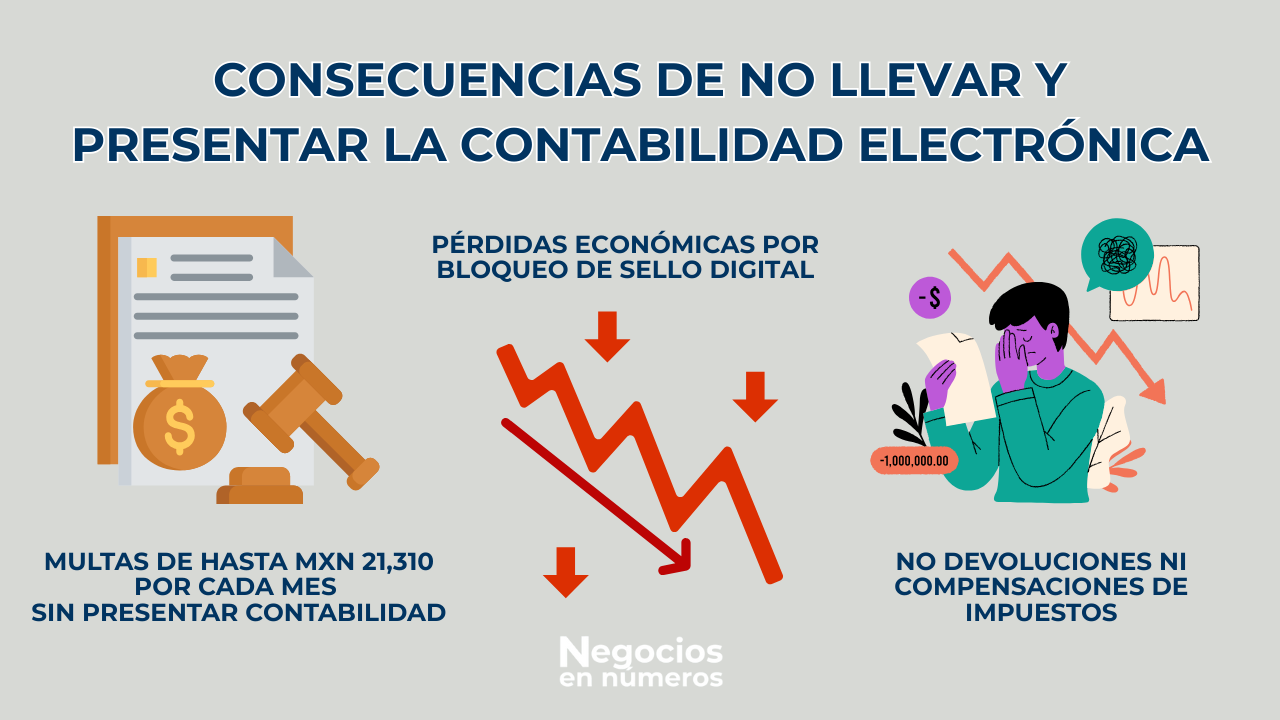 El incumplimiento del envío de la contabilidad electrónica puede llevar al bloqueo temporal del sello digital, lo que provocaría retrasos graves en tus ventas por la inhabilitación de tu facturación - Retrasos en trámites: